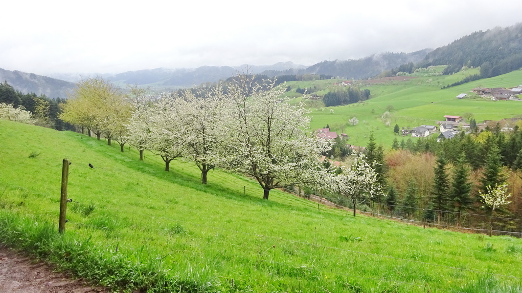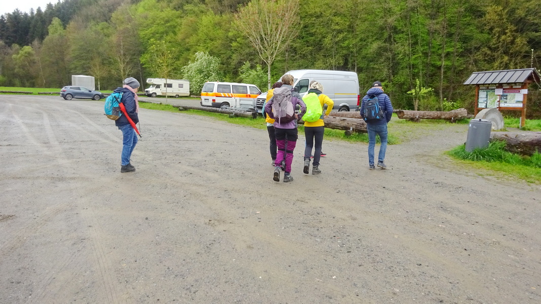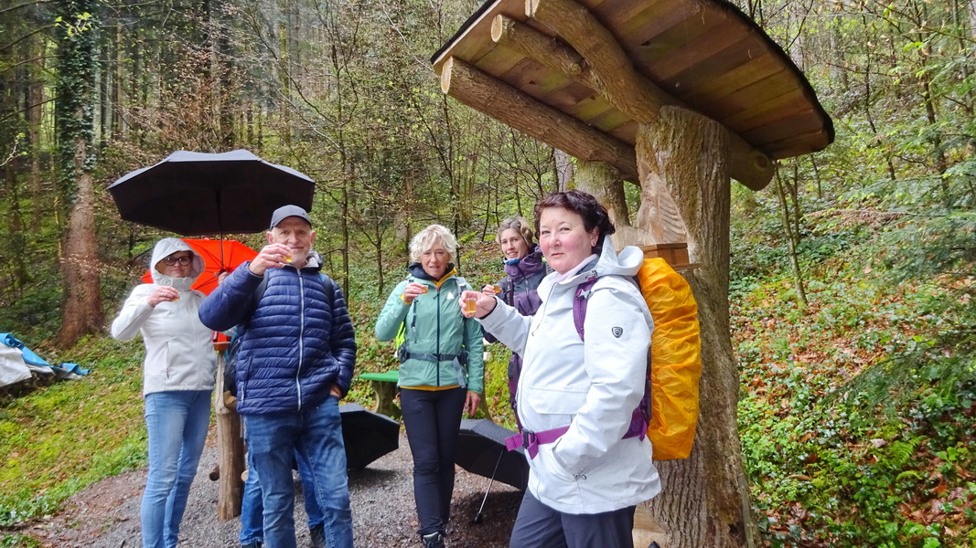 Am Sonntag 12. April führte uns Franz als Wanderführer auf den bekannten Hahn und Henne Weg. Vom Wiesengrund fuhren wir nach Unterharmersbach zum Parkplatz des Hahn und Henne Weges. Leider wollte sich die Sonne nicht blicken lassen und es nieselte leicht.